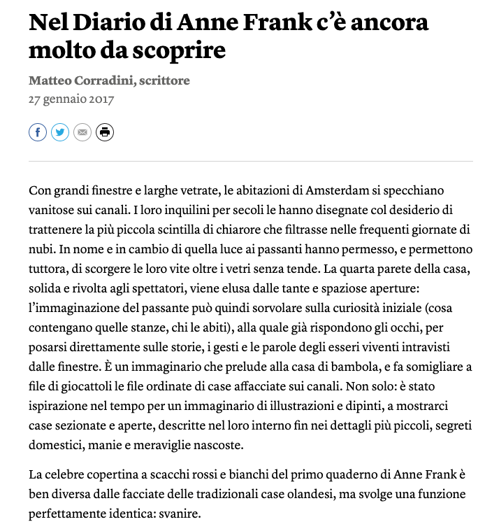 Il quattro agosto 1944, Anna Frank e la sua famiglia furono scoperti e arrestati a causa della soffiata di un delatore ignoto. Il Diario resta una delle testimonianze più intense dell’olocausto ebraico, un bell’articolo su Internazionale ci fa scoprire nuovi aspetti di quest’opera di una ragazza che avrebbe solo voluto fare la scrittrice.