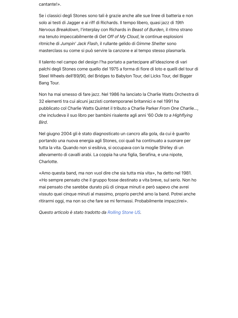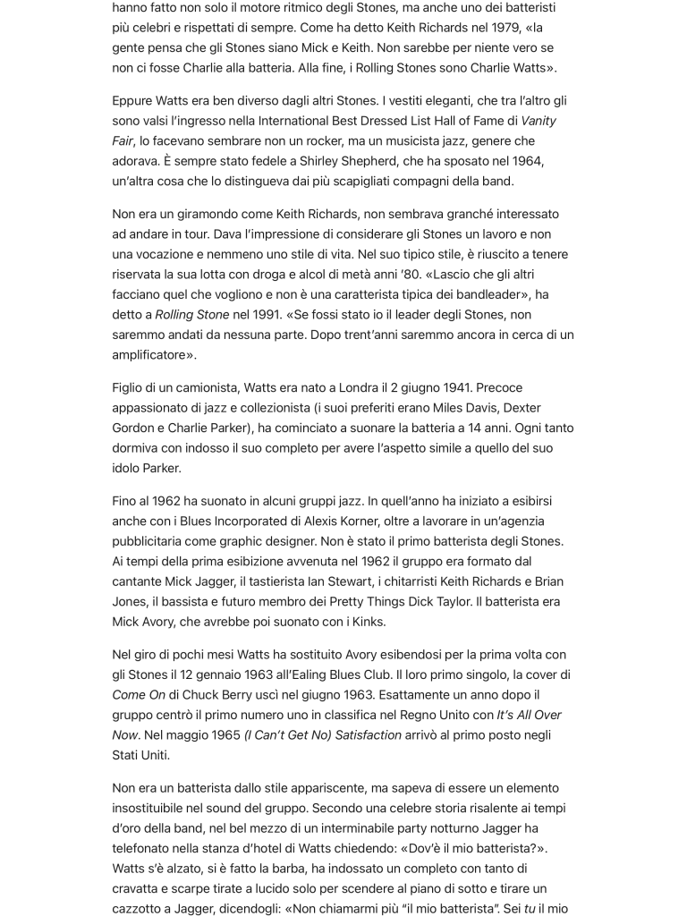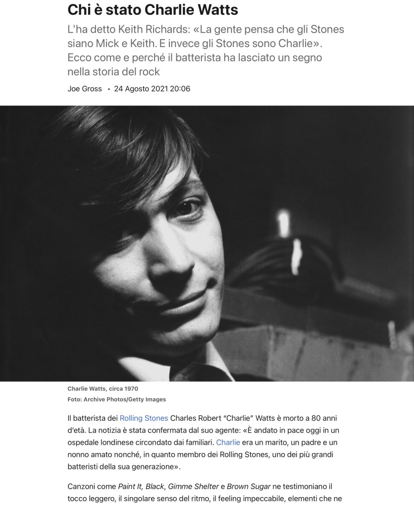 In un mondo di soli protagonisti, il metodico, indispensabile incedere di Charlie ci ricordava l’importanza delle retrovie, della sostanza necessaria all’apparenza affinché tutto non si risolva in un imbroglio. Fai buon viaggio Charlie Watts, mancherai.